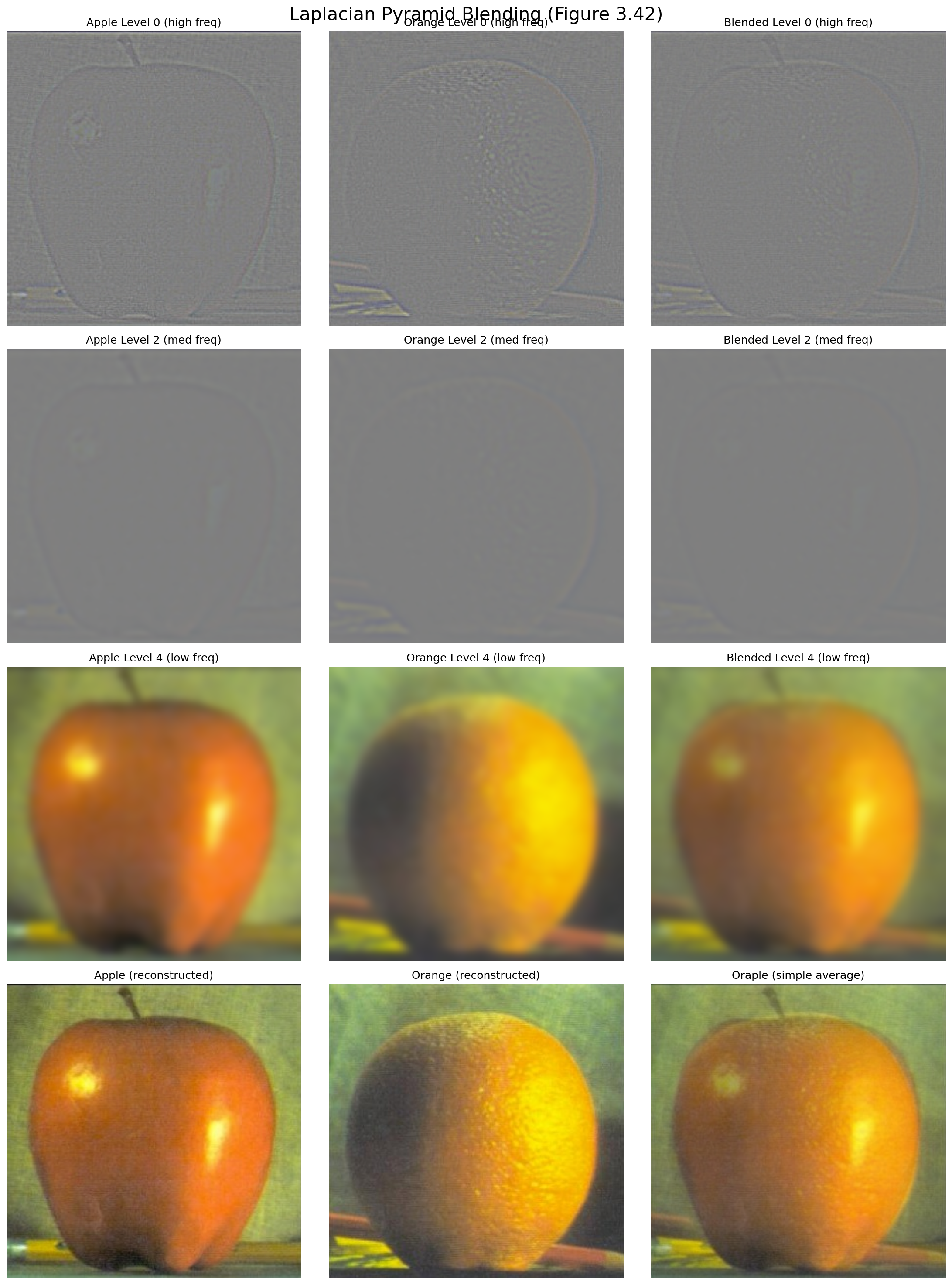 Each Gaussian level is smoother than the last, while each Laplacian level isolates different frequency bands. Summing across all Laplacian levels reconstructs the original image. These stacks are the foundation for the seamless blending in Part 2.4.