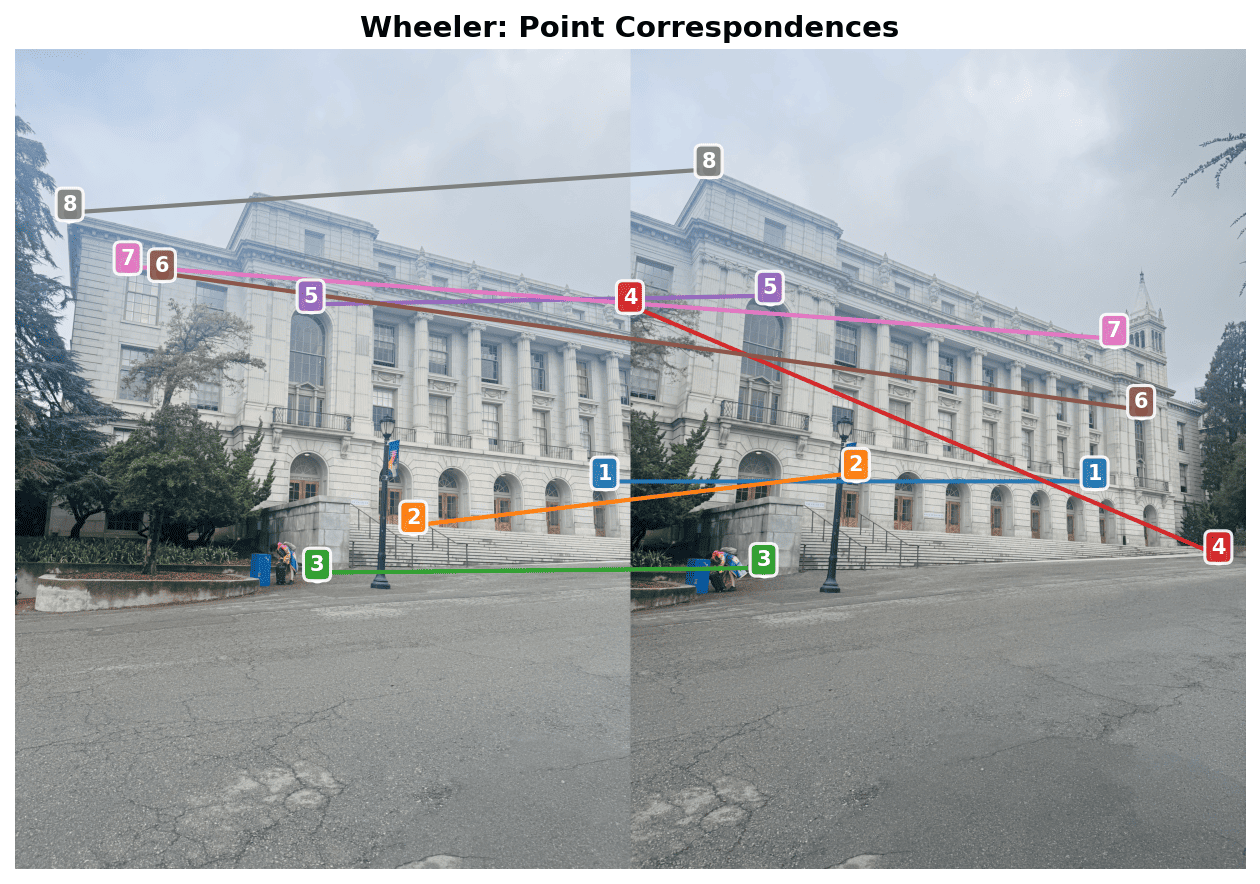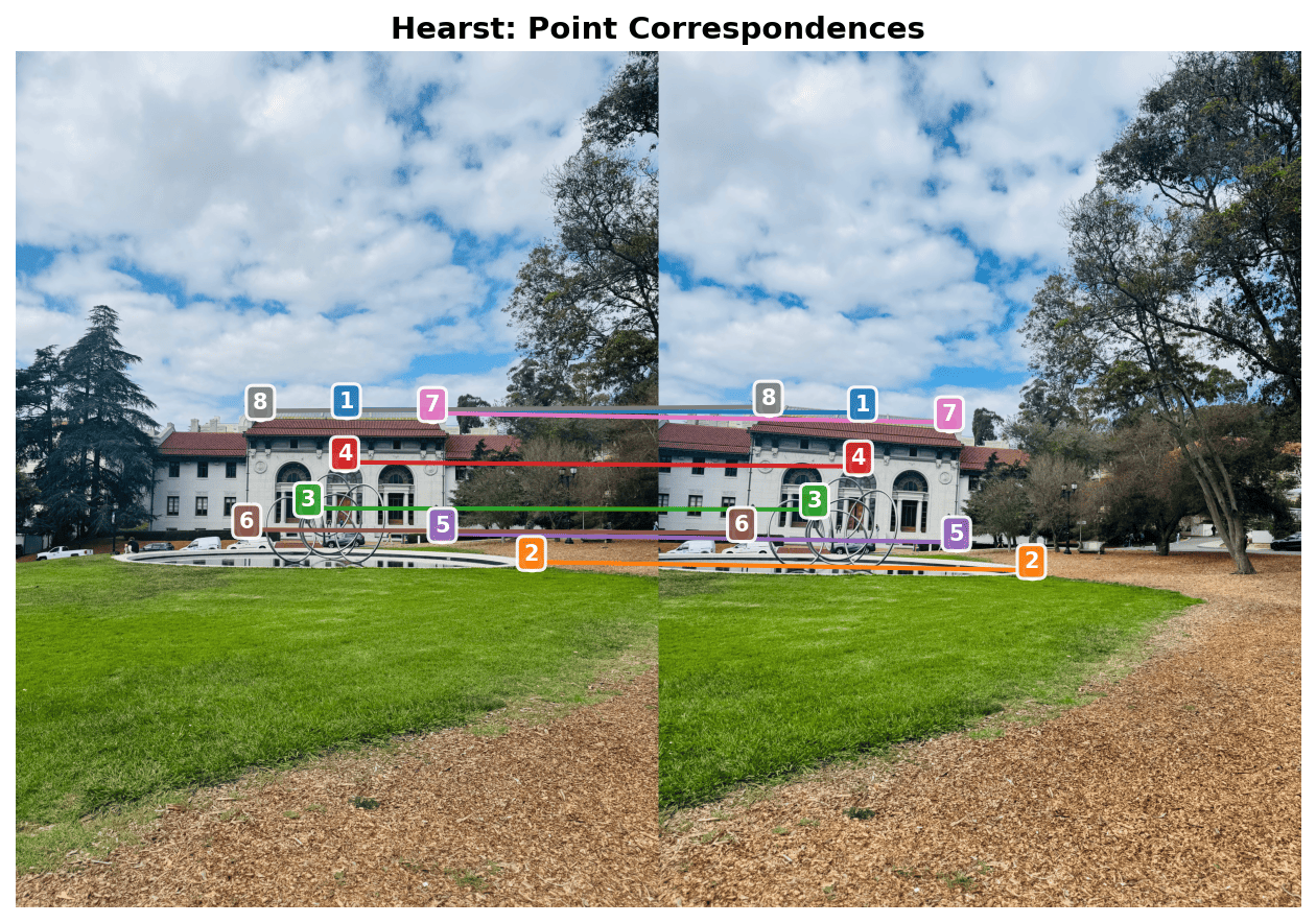 The biggest challenge was getting correspondences right. A few pixel error propagates through the homography and creates visible ghosting in the mosaic. I learned that precision in point selection is critical-choosing distinctive corner features rather than smooth regions made a huge difference in final alignment quality.