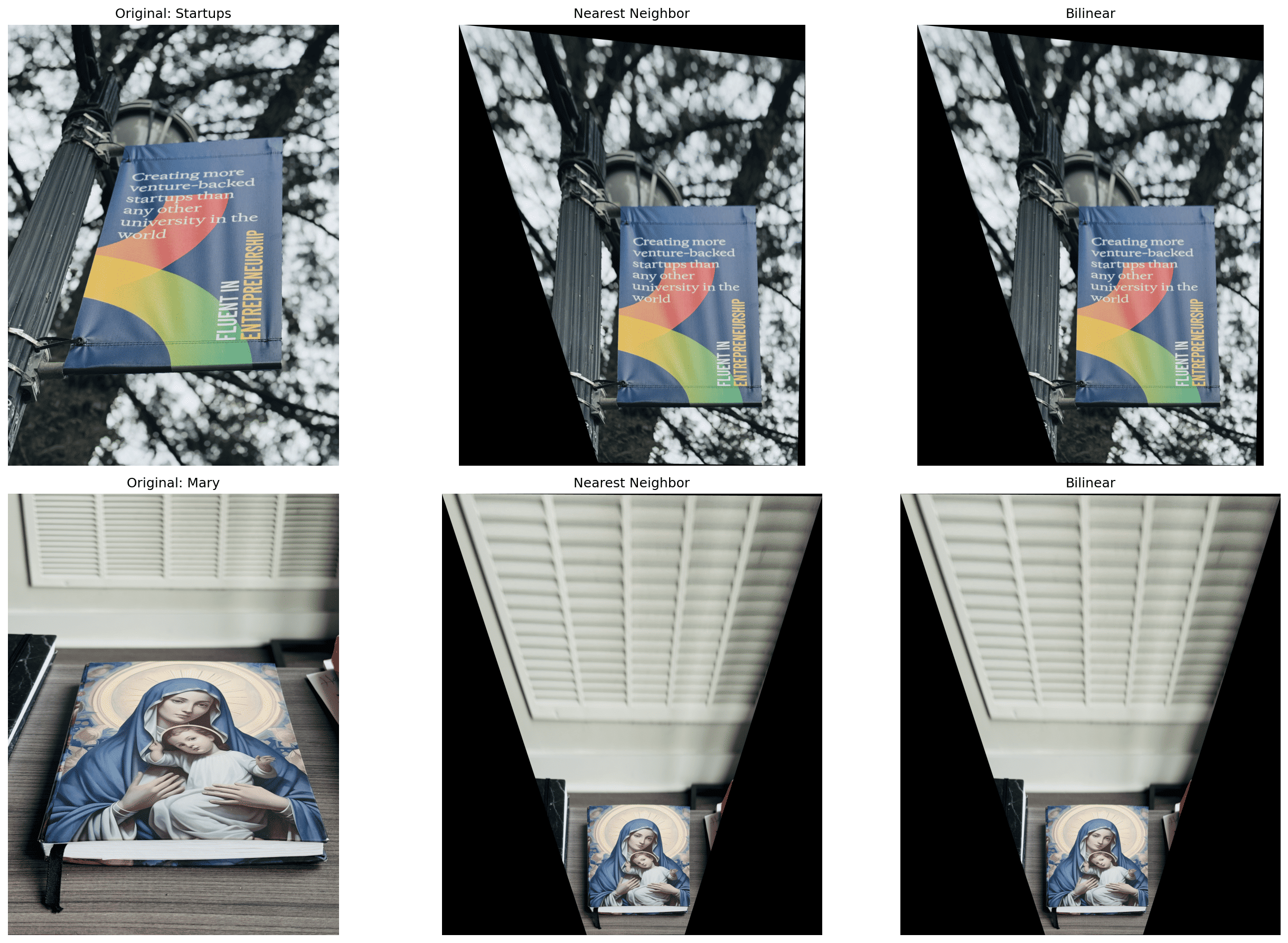 Implemented two interpolation methods using inverse warping to avoid holes. For each output pixel, we map back to the source image using H-1.