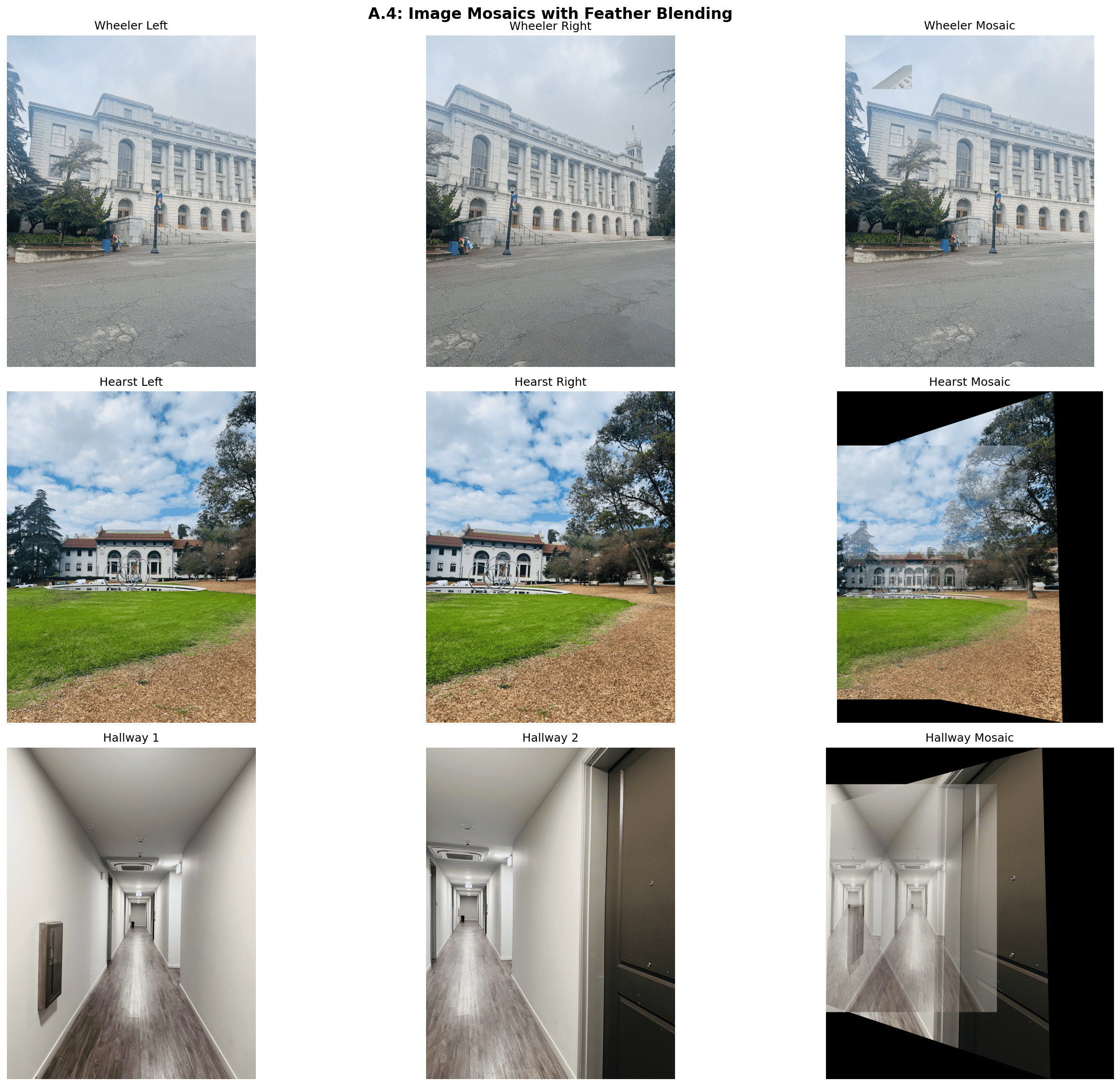 Using 4-point RANSAC with normalized DLT and symmetric transfer error, I estimate homographies and build mosaics with simple alpha blending. Shown below are three automatic mosaics (Hearst, Wheeler, Hallway).