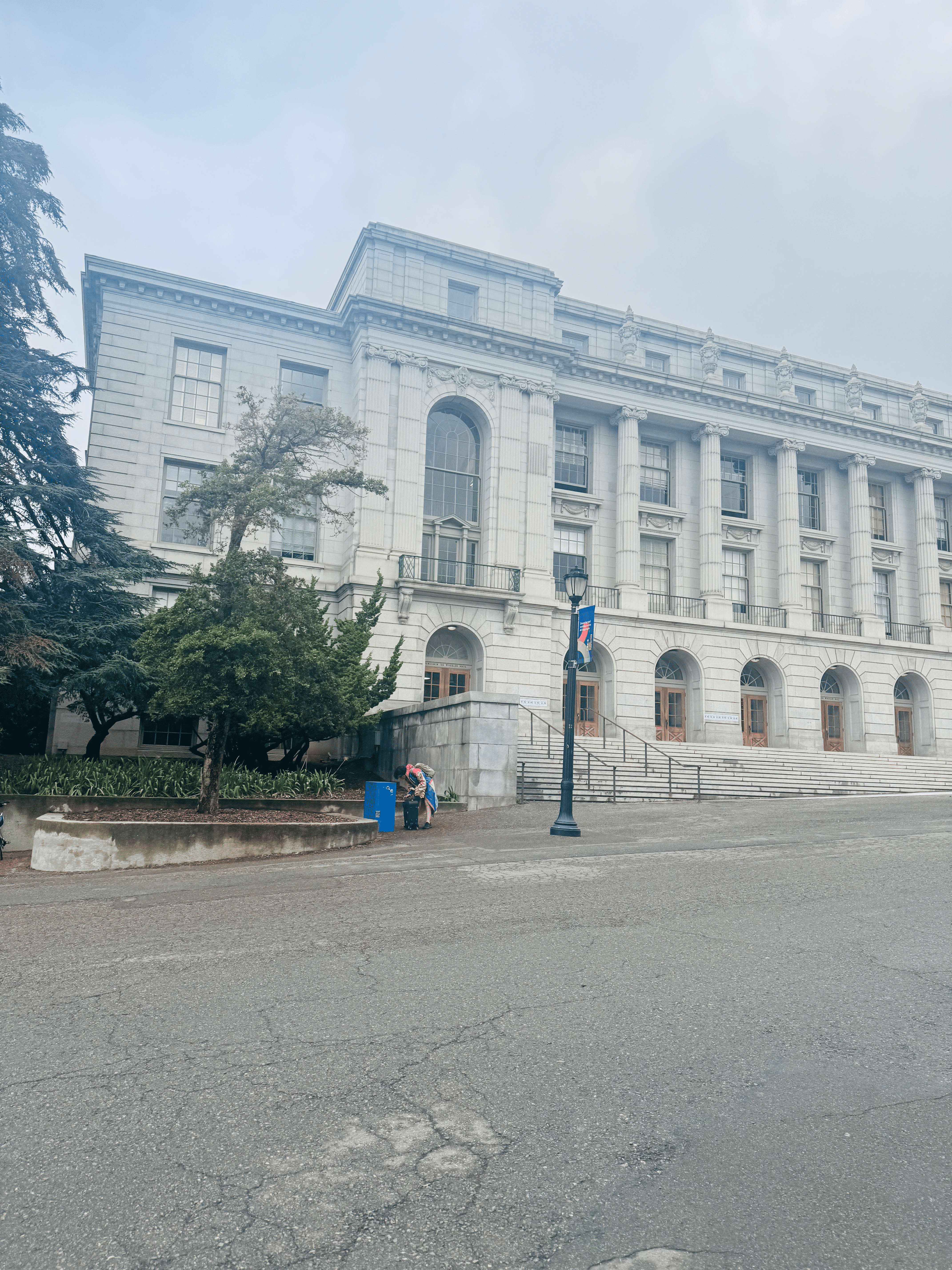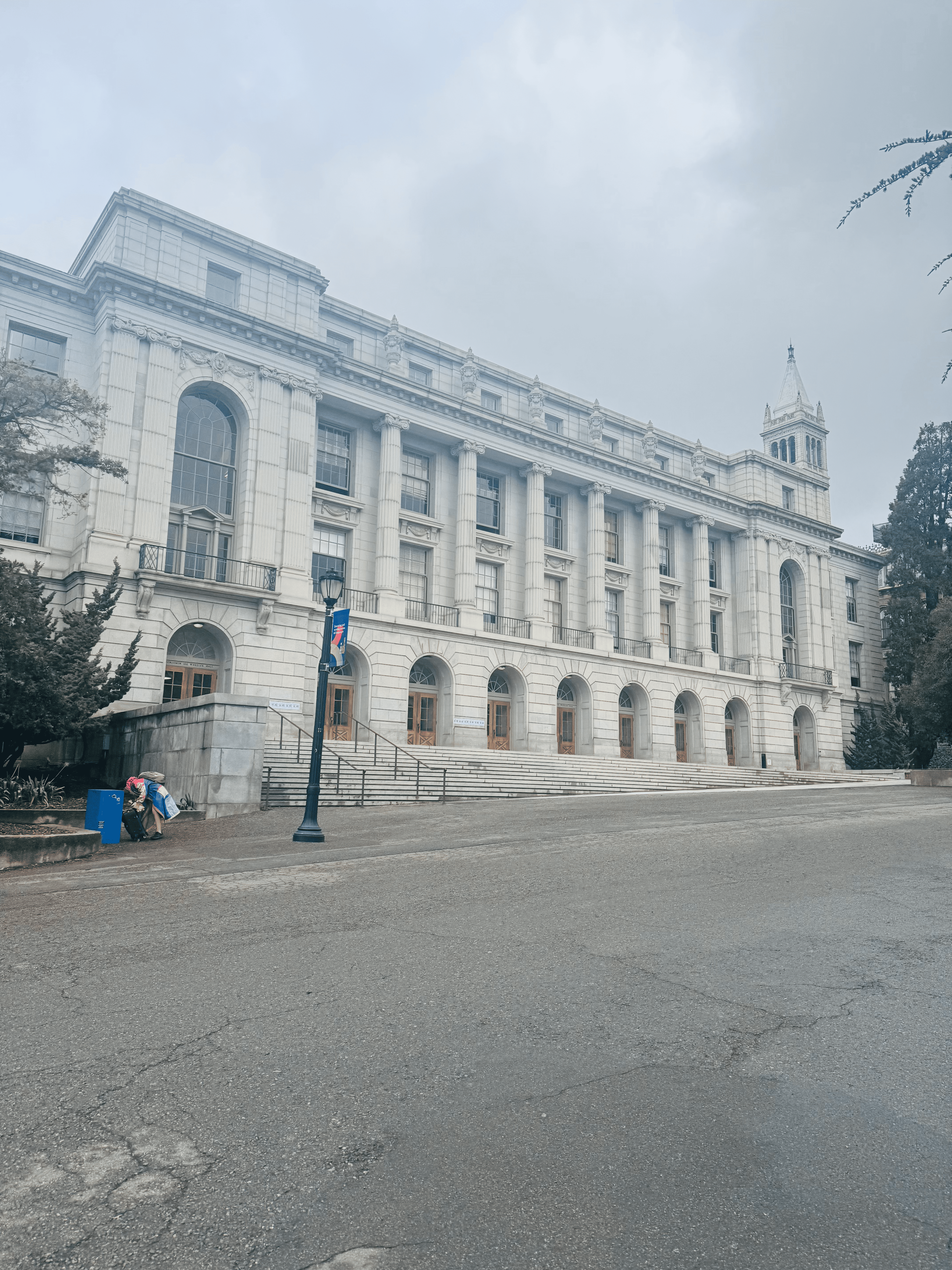 Fixed COP, handheld rotation (~55% overlap). Wheeler Hall exterior with architectural details.
